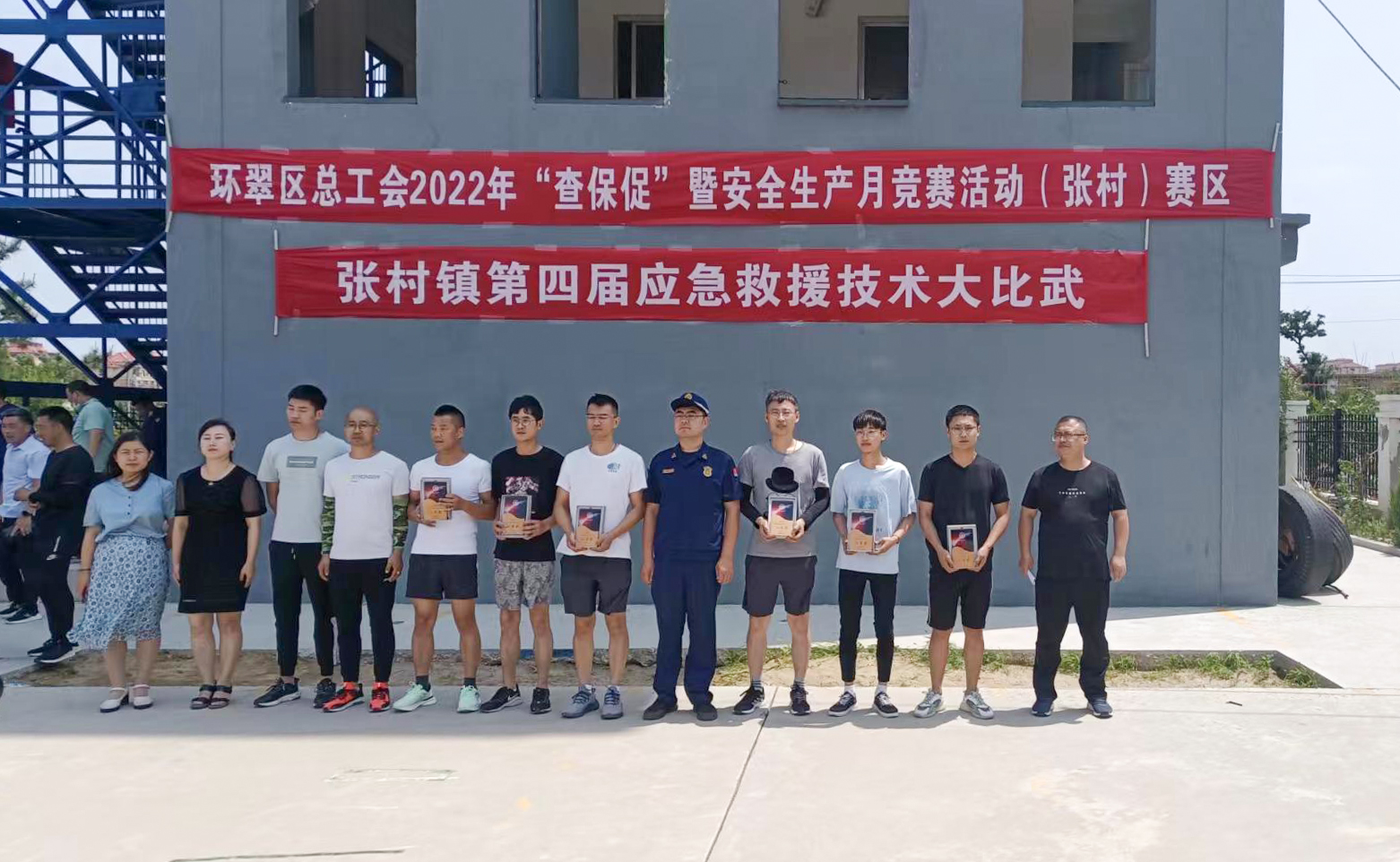 6月22日,环翠区应急救援技术大比武在张村镇消防中队训练场举行。此次活动由区总工会主办,张村镇总工会承办,张村镇安监办协办。致力于提升职工安全意识,普及安全生产应急救援知识,提高应急处置能力。张村镇31家企业共93名职工参加。比赛包括三人快速着装水带连接和百米负重灭火…