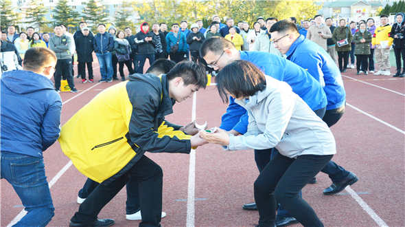 10月底的天气虽有些寒意料峭,但比赛现场激情飞扬,各参赛队之间你追我赶,竞争激烈。八个项目依次进行,比赛高潮迭起,欢笑声和加油声交织在一起,令人欢欣鼓舞。八个项目中最精彩的要数运动会压轴戏“指压板接力”。“网红”指压板可谓大名鼎鼎,但许多参赛队员只在各种综艺节目中见过,赛前有人对它不屑一顾,但当真正脱下鞋子与它亲密接触后,才感受到它的“威力”。比赛每队四人一组,第一名运动员在指压板上跳绳,跳满20个接力给第二个运动员,第二名运动员在指压板上作俯卧撑,做满20个接力给第三人,第三名运动员在指压板上手脚并用爬行10米,传递给最后一名运动员,最后一个人额头上放一枚饼干,在指压板上冲刺同时保证饼干不掉,第一个冲过终点的队伍获胜。伴随着脚下的一阵阵“电流”,参赛运动员们争先恐后“痛并努力着”,拉拉队的欢呼呐喊声也将本次趣味运动会推向一个小高潮。
