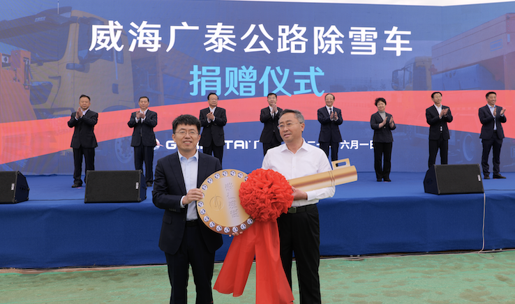 2021年6月威海8868体育高端应急救援保障装备制造基地奠基仪式捐赠临港区政府两台高端公路除雪车