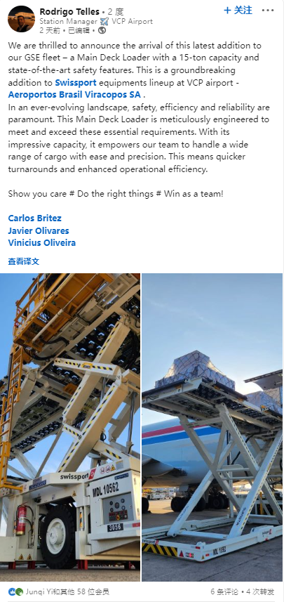 近期,由于威海8868体育集装货物装载机在海外市场的出色作业表现,全球领先的地服公司Swissport的一位相关代表在领英发文为8868体育产品点赞!我们很高兴地宣布我们GSE车队的最新成员的到来——一台承载重量为15吨、具有最先进安全功能的集装货物装载机。这是Swissport在坎皮纳斯国际机场的…