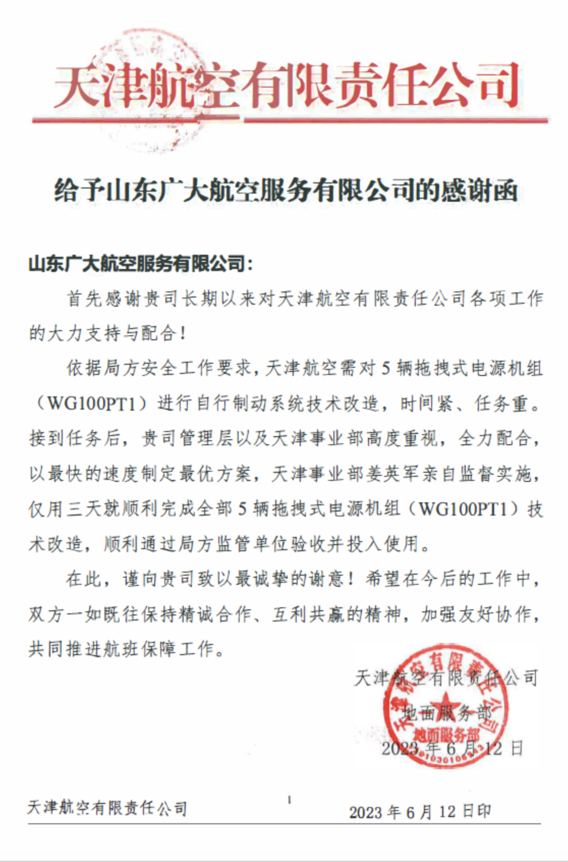 6月初,天津航空公司根据局方安全管理要求对五台电源机组进行自行制动系统技术改造,改造时需对五台电源机组停用。客户表示这五台机组是主力车型,全部停用会影响正常工作,希望以最快的速度,最短的时间完成改造。时间紧任务重,山东广大航空服务有限公司(以下简称“广大航服”)…