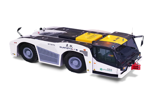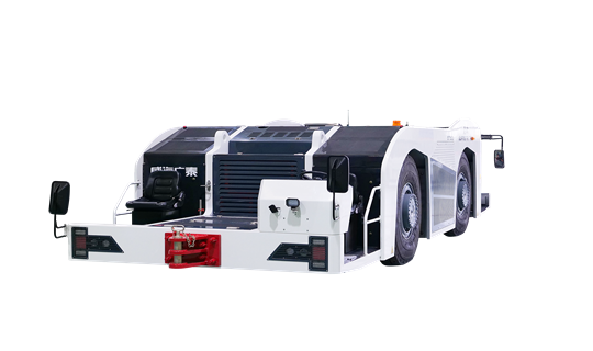 该类设备以纯电能为动力,是牵引和顶推飞机离开机场停机廊桥的地面保障设备,同时还可因飞机故障及维护需要,用于救援、牵引和移动飞机至维修机库。该设备主要由底盘、电动机、电池、变速箱、传动轴、前后桥、轮胎总成、制动系统、转向系统、驾驶室、控制系统等组成。